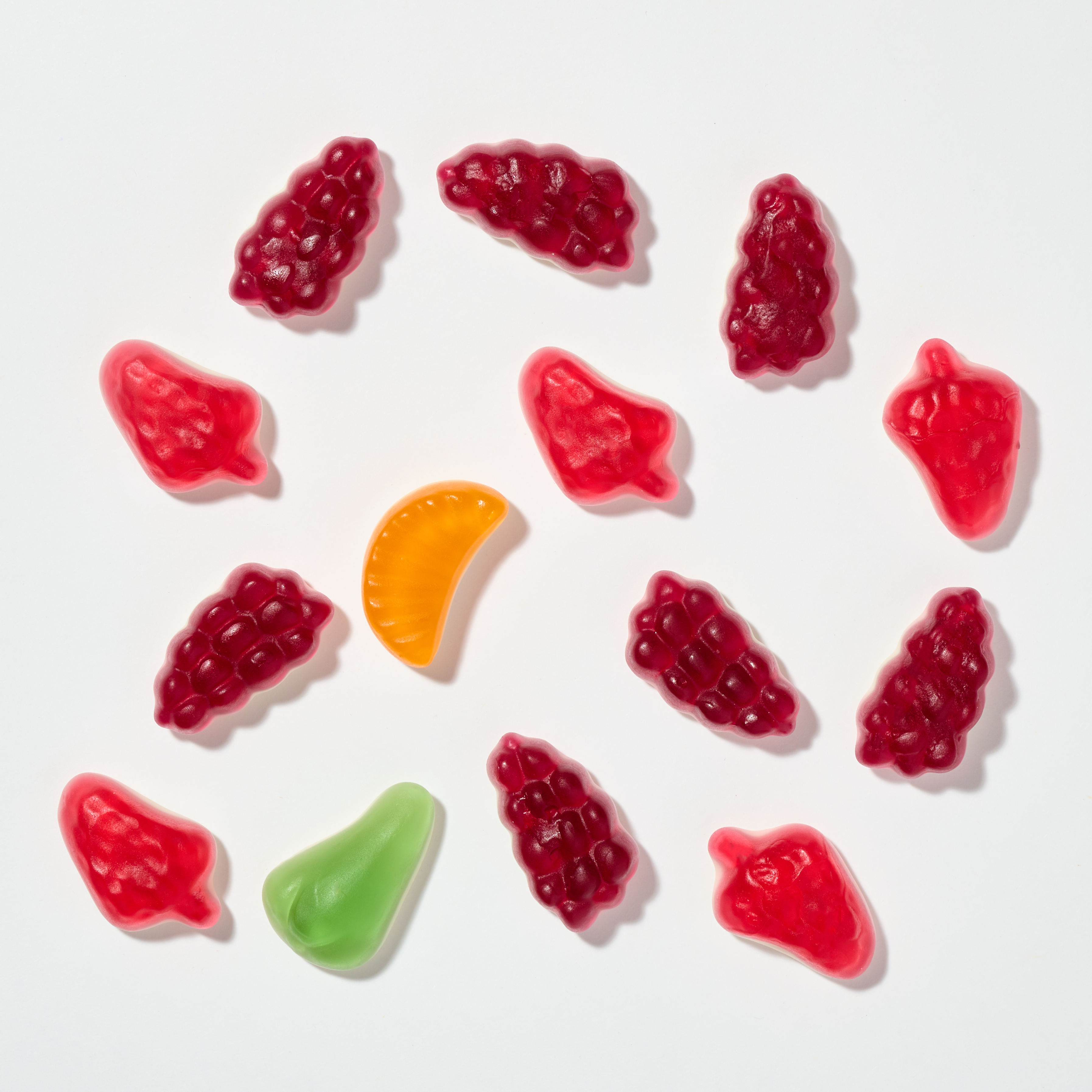 Жевательный мармелад в виде ягод со вкусом малины, ванили, груши, клубники и апельсина.
