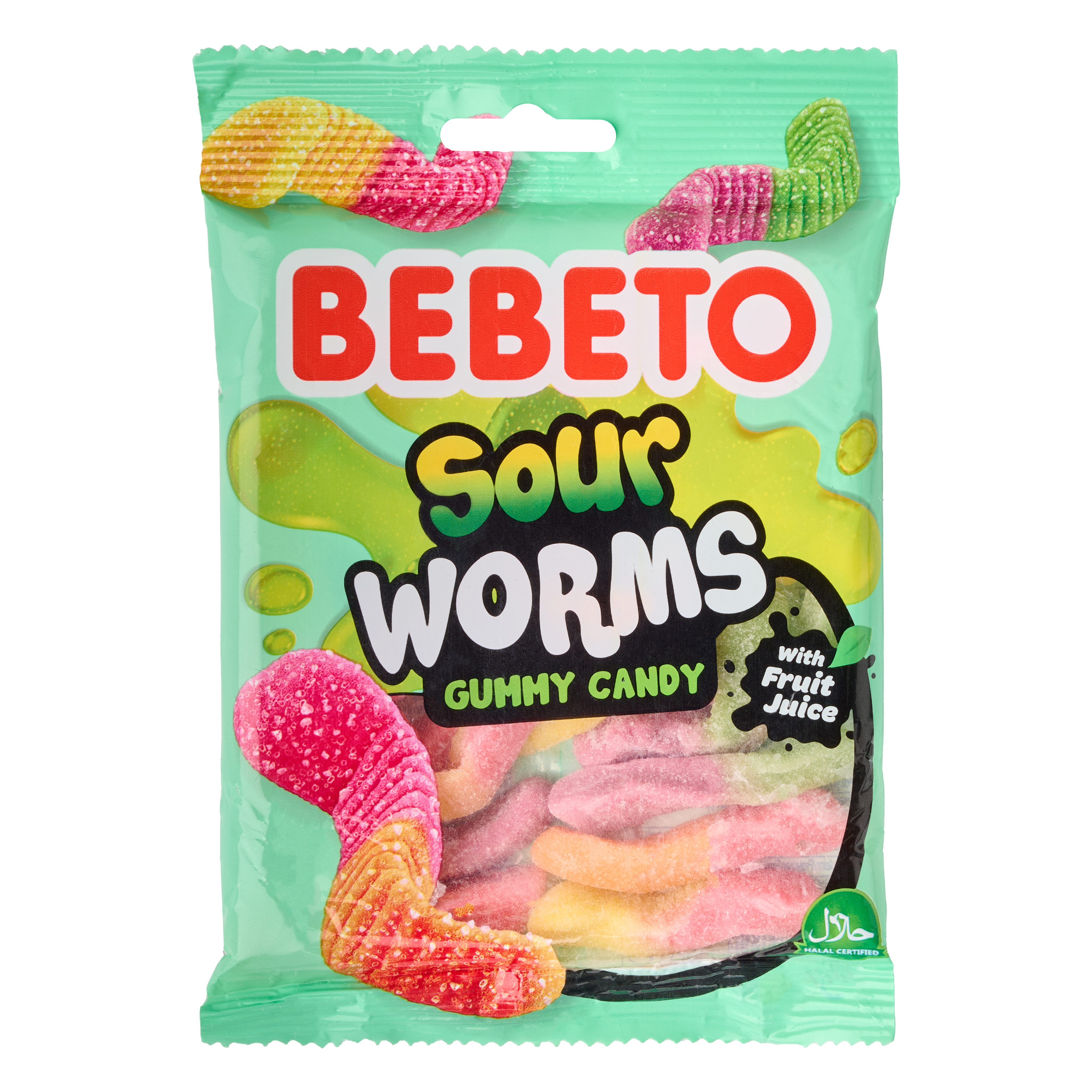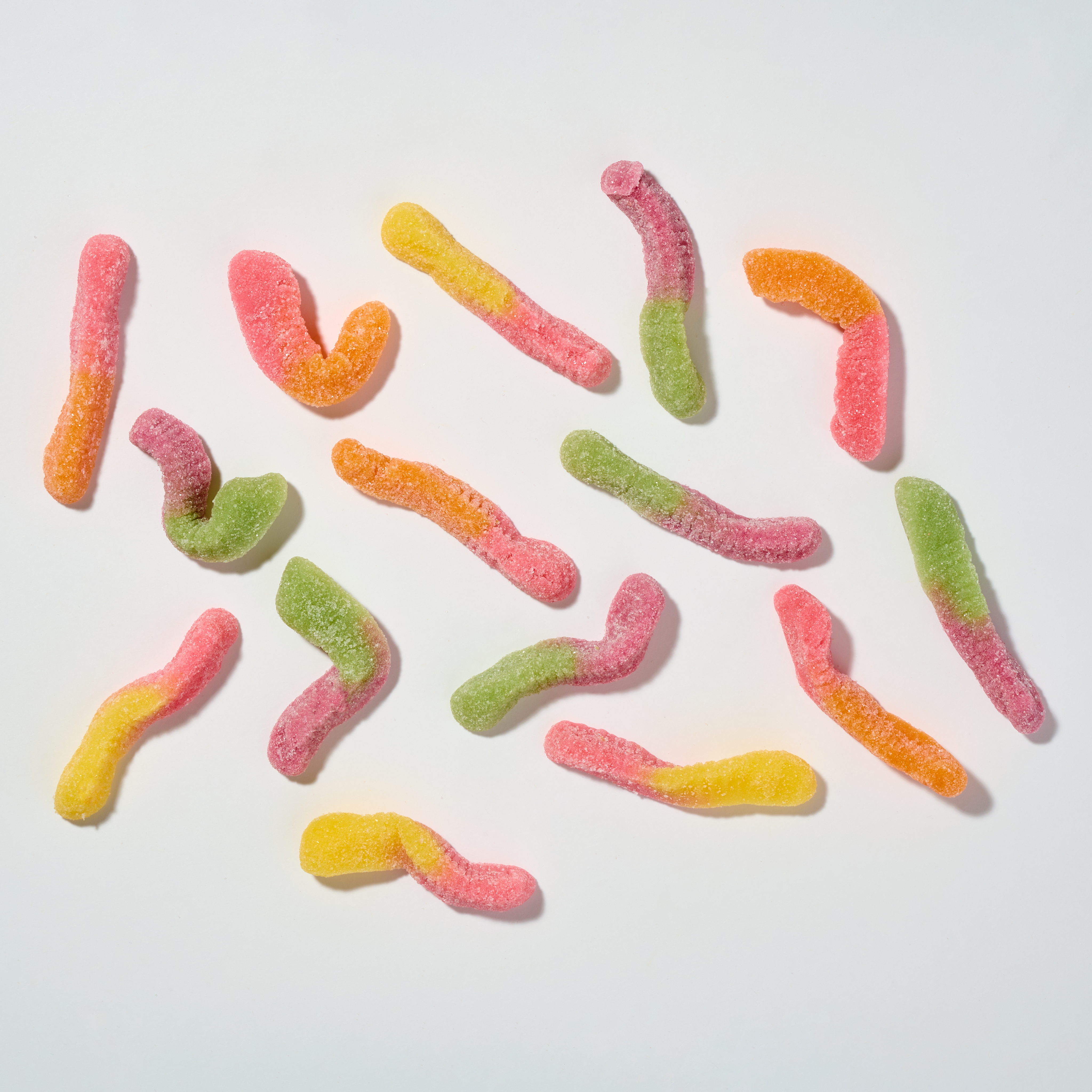 Кислые мармеладные червяки со вкусом лимона, винограда, вишни, тутти-фрутти и апельсина.